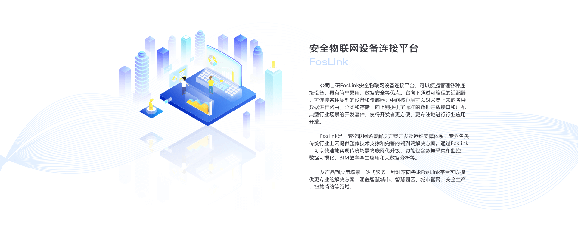 Foslink是一套物聯(lián)網(wǎng)場景解決方案開發(fā)及運維支撐體系,專為各類傳統(tǒng)行業(yè)上云提供整體技術(shù)支撐和完善的端到端解決方案。通過Foslink,可以快速地實現(xiàn)傳統(tǒng)場景物聯(lián)網(wǎng)化升級,功能包含數(shù)據(jù)采集和監(jiān)控、數(shù)據(jù)可視化、BIM數(shù)字孿生應用和大數(shù)據(jù)分析等。